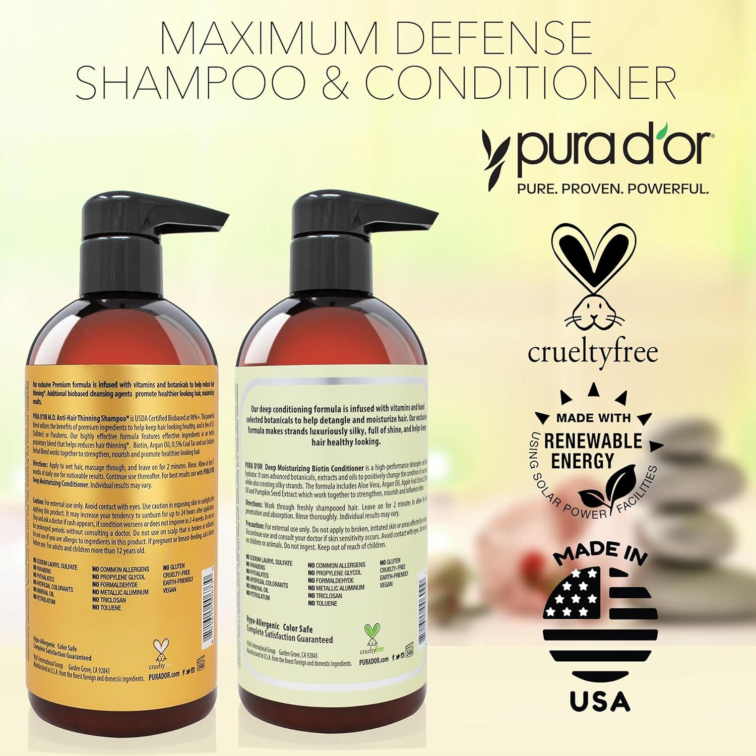 PURA D'OR Maximum Defense Anti Hair Thinning Shampoo and Deep Moisturizing Biotin Conditioner are both developed with a blend of natural extracts gathered from different corners of the globe to help combat the most common scalp issues related to thinning hair. Our shampoo uses ingredients that are rich in antioxidants, vitamins and nutrients. This anti-thinning hair thickening set nourishes your hair from roots to tips, soothes the scalp from itching, and improves manageability. PURA D'OR Maximum Defense hair thickening products for women and men is safe to use on natural, processed, or colored treated hair, and can become a vital part of your daily shampoo and conditioner routine. It is gentle on your hair and hypoallergenic because PURA D'OR doesn't use any SLS, parabens or Artificial scents to any of our products. Our vegan shampoo and conditioner set is clinically tested for your safety.
